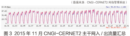 2015年11月CNGI-CERNET2主干网流量相比10月有小幅度提升。11月入流量均值为32231.002Mbps,相比10月增加了10.65%,与2014年同期相比减少了8.95%;11月CNGI-CERNET2出流量均值为34062.654Mbps,环比增加了9.87%,与2014年同期相比减少了8.51%。