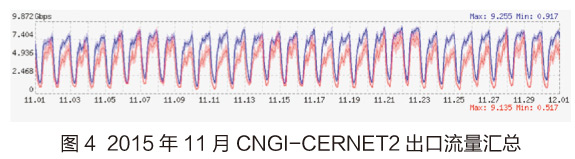 11月CNGI-CERNET2出口流量较10月相比有小幅度下降。11月入流量月峰值为9.255Gbps,出流量峰值9.135Gbps。