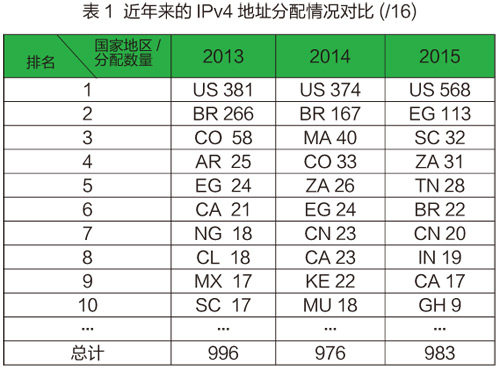 自亚太地区APNIC、欧洲地区RIPENCC、拉美地区LACNIC的IPv4地址池相继耗尽之后,2015年9月北美地区ARIN的IPv4地址池也宣布耗尽。整体而言,2015年全球IPv4地址分配数量与2014年和2013年持平,见表1。2015全年获得地址较多的国家/地区,依次是美国、埃及、塞舌尔、南非、突尼斯、巴西等。