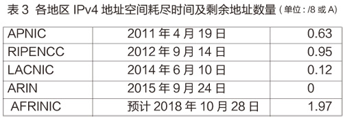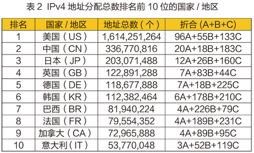 截至2015年底,全球IPv4地址分配总数为3,623,587,768,折合215A+251B+143C,地址总数排名前10位的国家/地区,见表2。各地区IPv4地址空间耗尽时间及剩余地址数量见表3。