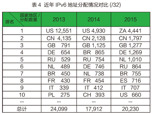 2015全年全球IPv6地址分配数量为20,230*/32,与2014年相比,有上升。2015全年获得IPv6地址分配数量较多的国家/地区,依次是南非、中国、英国、德国、荷兰、俄罗斯、巴西、西班牙、意大利、美国等等,近年IPv6地址分配情况对比(/32)见表4。