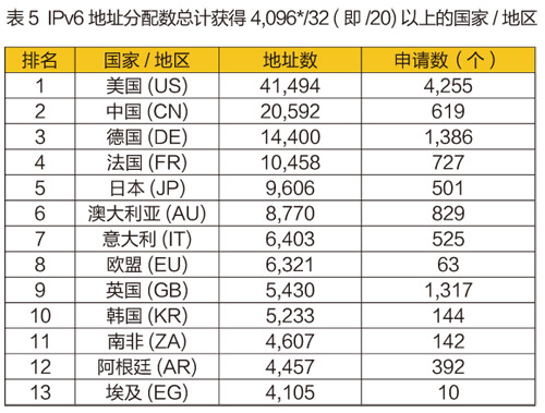 截至2015年底,全球IPv6地址申请(/32以上)总计20,055个,分配地址总数为180,104*/32。地址数总计获得4,096*/32(即/20)以上的国家/地区,见表5。