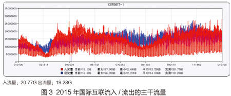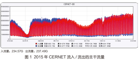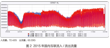 2015年CERNET主干网络运行情况良好,在CERNET国家网络中心和各节点老师的共同努力下,主干网网络平均可用率99.993%,延时合格率100%,丢包合格率100%。2015年,国内互联随着沈阳移动万兆、成都联通万兆、重庆移动万兆、郑州移动万兆、西安电信万兆的开通,总入流量比2014年增加了19.94G,总出流量增加17.21G,线路质量有了明显改善;国际互联总入流量比2014年增加了7.01G,总出流量增加了9.03G,教育网的出国带宽紧张的状况也有了大大地改善,详情如图1-3所示。除了网络可用率的提升外,其他衡量网络性能的指标如丢包率、网络时延等都得到了大幅度地改善,能够更好地为教育网用户服务。