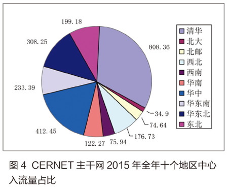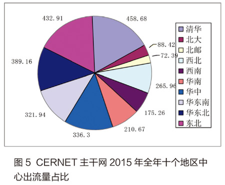 由图4、5可知2015年全年十大地区网入流量清华居首,华中地区次之,第三是华东北地区;出流量第一是清华,第二是东北地区,第三是华东北地区。