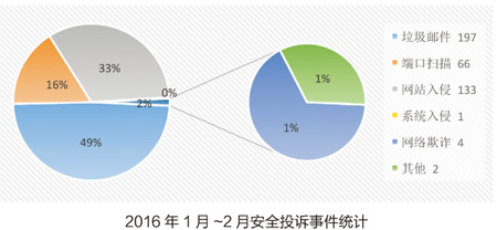 由于寒假期间教育网在线用户数量较平常大幅减少,因此相关的投诉事件数量也大幅地减少。不过由于各类网站系统属于长期在线的,因此与网站入侵有关的事件数量还是高位运行。