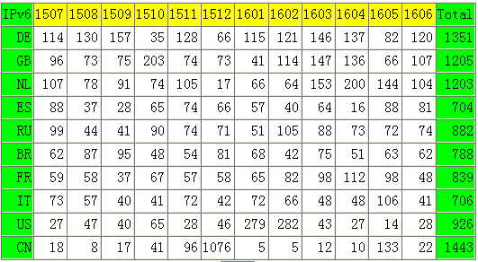6月全球IPv6地址申请(/32以上),总计有316个,其中欧洲143个,拉美78个,亚太67个,北美19个,非洲9个,分别来自63个国家/地区。申请个数最多的是巴西,62个,其次是中国,22个。6月较大的申请,有1个/24来自阿根廷。6月全球IPv6地址分配数量为1512*/32,其中分配地址数量最多的是阿根廷,265*/32;其次是德国,120*/32。在过去的12个月,获得的IPv6地址数量最多的是中国,1443*/32,其次是德国,1351*/32。