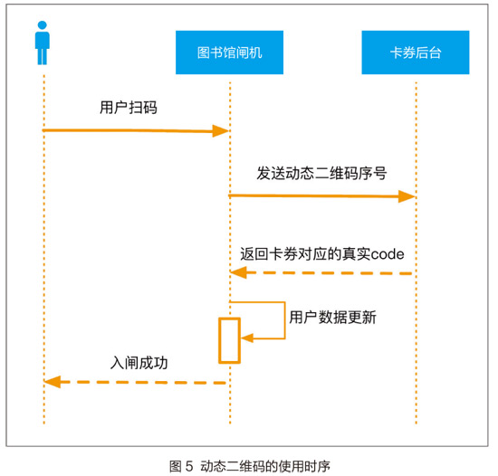 在使用过程中,每个动态二维码只能识别一次,一旦识别后立即失效。为了增加安全性,我们还对闸机和后台验证系统进行设置,制定多种安全策略,如一段时间内实体卡和电子卡不能先后使用,一段时间内同一个学工号不能多次进入图书馆等,以尽可能避免用户将实体卡和电子卡主动出借给他人使用。以图书馆闸机为例,动态二维码的使用过程如图5所示。