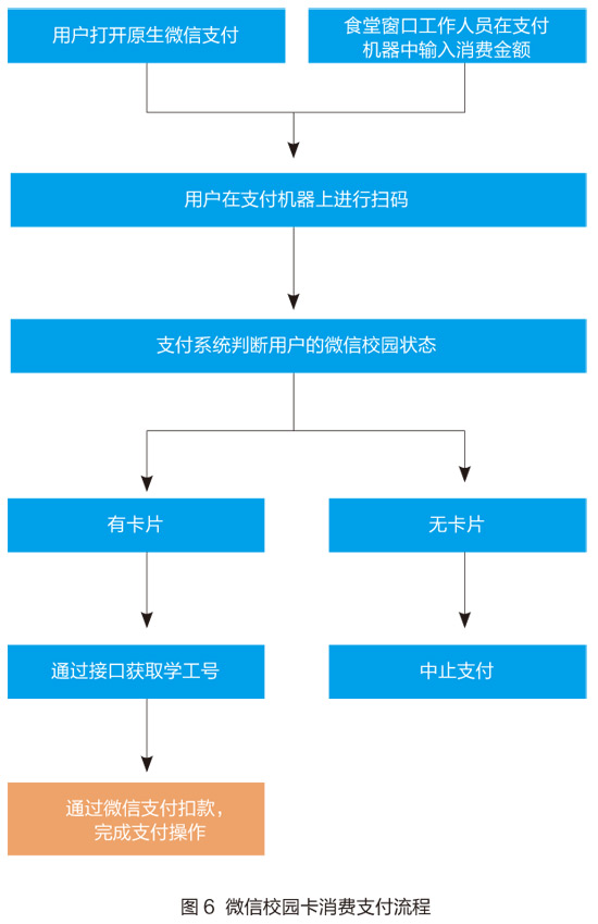 以食堂窗口消费为例,用户在付餐费时,可以打开微信校园卡,在其中调出支付界面,或是直接打开原生的微信支付,即可发起带有身份识别功能的支付行为。食堂窗口工作人员在支付机器中输入消费金额后,用户再进行支付二维码扫码,此时系统将判断用户的微信校园卡状态,若存在卡片则表明该用户为校内人员,此时继续完成支付操作,若不存在卡片则表明该用户当前身份并不明确,系统将中止支付,如图6所示。在支付过程中,经定制的系统还将显示消费者的公共数据库照片,以便于窗口工作人员进行相貌比对。