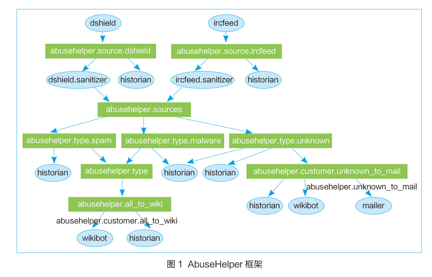 根据CERT组织性质的不同,现有安全事件自动响应方法可以分为两类:自动通知/分发和自动拦截。如果是运营商或国家的CERT,在对安全事件数据进行富化之后,一般需要将事件分析进一步通知或分发给安全事件发生的单位,如由芬兰、比利时等国的国家CERT(CERT.FI,CERT.BE,CERT.EE)开发的工具AbuseHelper,如图1所示。该工具基于IRC协议的框架和python语言搭建了一个可扩展的事件分发框架。不同来源的安全事件被输入IRC的频道(channel),每个频道由对应的程序(bot)完成不同的任务,如IP/域名归属信息获取,输出到数据库,发送邮件等。