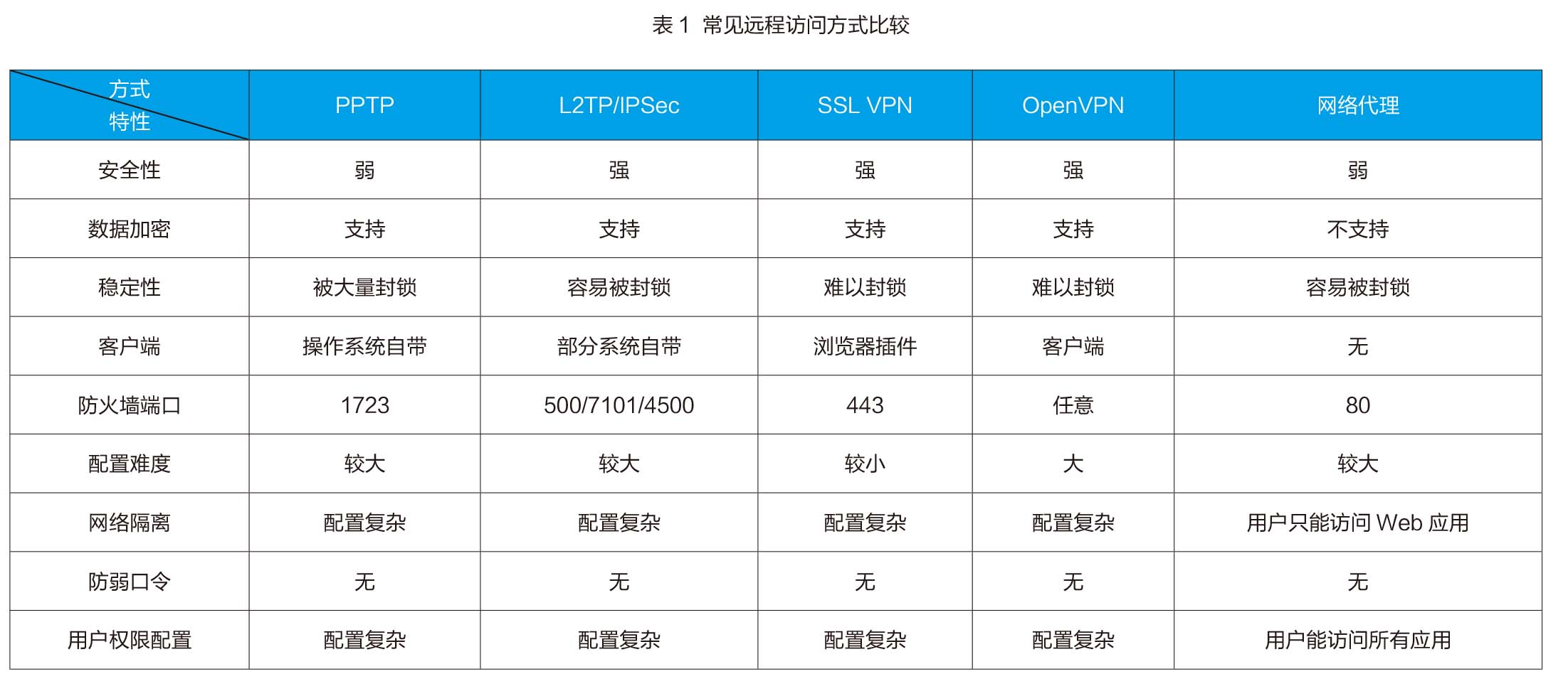 目前常见的远程访问技术有:传统VPN(PPTP、L2TP/IPSec)、SSLVPN、OpenVPN、内网代理等,技术参数比较见表1。