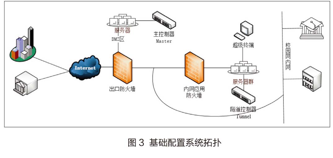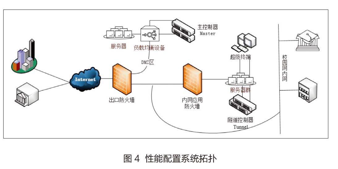 性能配置针对校外访大问量、高并发量的使用需求,在校外师生可访问的区域防火墙(DMZ)部署两台访问控制器,为校外用户提供身份认证、角色和权限配置以及系统和数据的基本安全功能;在内网的服务器区,部署两台隧道控制器和两台超级终端,来进行具体的业务任务。系统拓扑如图4所示。