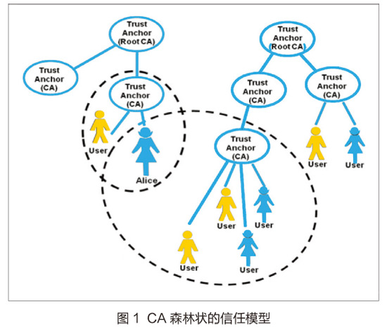 涉及到开放环境中的加密和认证,目前主流的商业应用中很难脱离可信第三方,在Web应用中也就是我们要讨论的Web PKI,它是SSL/TLS的基石,X.509证书是HTTPS的关键要素。单独看每一个CA,它所签发证书的这个信任链就像是一棵树。因为世界上有许多这样的CA,所以整个互联网的信任模型是一个森林状的结构,如图1所示。