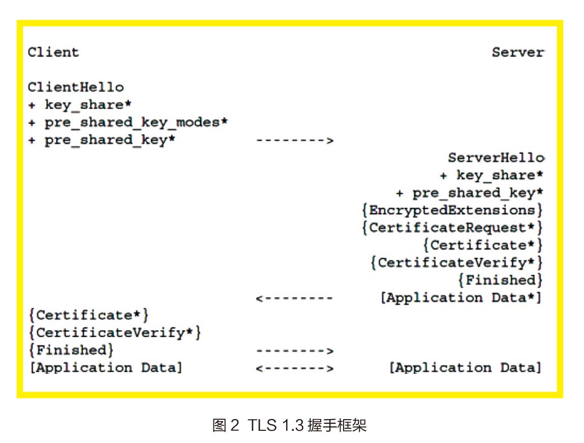 有一个比较有趣的细节,TLS新标准的名字并不是TLS 2.0或者其他名字,而是TLS 1.3,即延续了TLS 1.0、1.1和1.2的名称。这说明1.3是之前版本的升级,TLS协议的大致框架并未发生本质改变。图1、2为TLS 1.2和TLS 1.3握手协议的对比(细节请参照标准文档)。然而,TLS 1.3是TLS标准更新过程中变动最大的一次,除了对运行过程中的若干问题如密码套件的选择、密钥的计算方式、握手消息的发送方式等做了更改之外,TLS 1.3还增加了新的握手模式,以满足不同应用场景的需求。