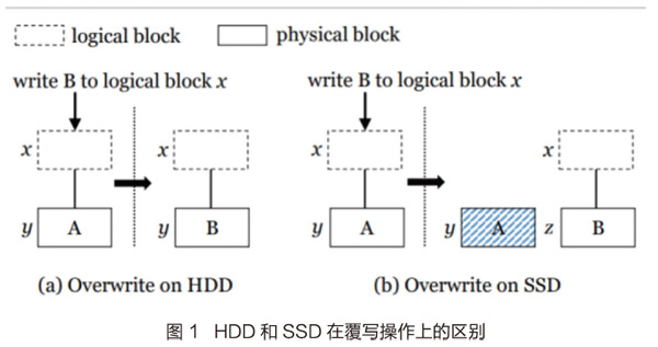与HDD一个显著不同是,当逻辑上的覆写发生时,HDD会直接在物理硬件上覆写数据,而SSD通过out-of-place机制覆写。在发生覆写时,SSD把数据写到新的区块中,将旧的区块标记为无效并且通过Garbagae Collegection回收无效区块,这种差异可以通过图1更为清晰地展示。由此可见,SSD天然地会对被上层修改过的数据进行一段时间的备份。因此,我们利用这一个硬件特性来设计FlashGuard。