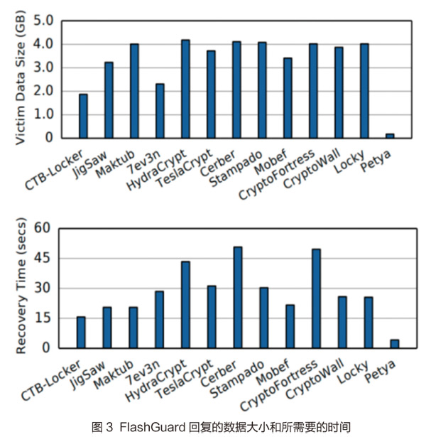 通过使用上文提到过的1477个Ransomware实例做攻击实验。然后在攻击完成后通过FlashGuard恢复被加密的数据。最终实验结果表明,对于实验中使用的所有Ransomware,FlashGuard都可以成功恢复全部被加密的数据。FalshGuard回复的数据大小和所需要的时间如图3所示。