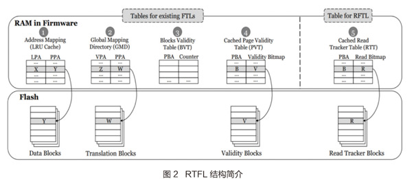 RTFL对于SSD已有的FTL进行了适当的修改。只要是通过加入一个Read Tracker Table(RTT)来记录一个硬盘页面是不是被读取过。LPA:逻辑页地址;PPA:物理页地址;VPA:虚拟页地址;PBA:物理块地址。
