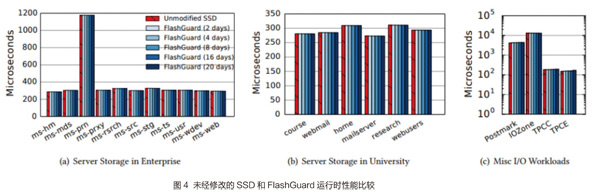 在性能方面,我们实验中用到的数据都是从真实的应用场景中得来的,比如微软剑桥研究院服务器和大学电脑上的I/O数据记录。在实验之前,我们执行了5千万次读写操作“预热”系统。实验证明FlashGuard带来的性能损失微乎其微,性能影响实验结果如图4所示。(责编:杨洁)