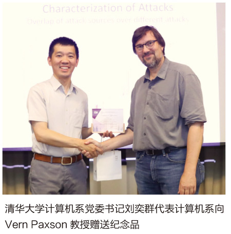 会后,清华大学计算机系党委书记刘奕群代表清华大学计算机系向Vern Paxson教授赠送了纪念品,Vern Paxson教授对清华大学计算机系庆祝建系60周年表示了祝贺。