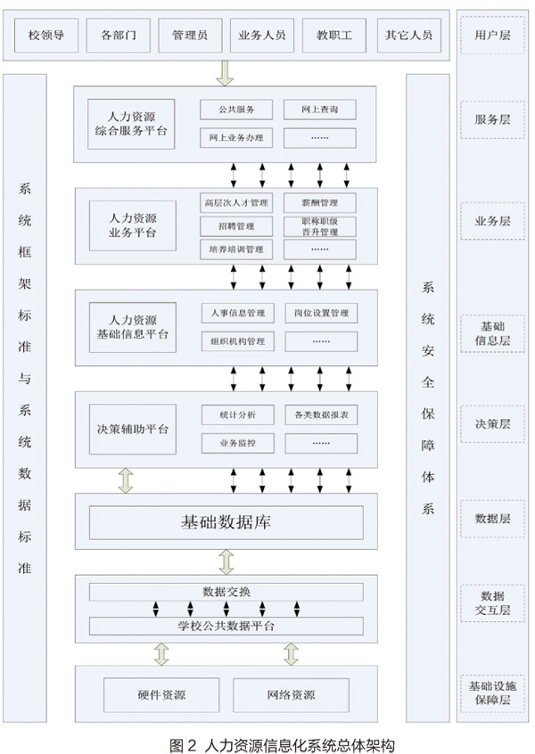 人力资源信息化系统建设将由多系统平台、多模块构成,采用模块与数据库相结合的方式建设,并集成于统一的平台,同时对平台配合安全保障体系,系统架构如图2所示。