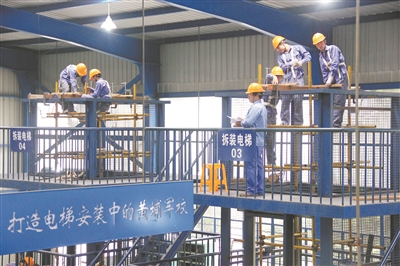溧阳市天目湖中等专业学校学生在教师指导下进行电梯安装。赵冬摄