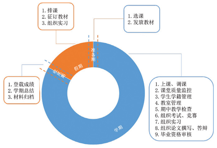 教务工作涵盖教学研究、教务运行、质量监控、实践教学、专业建设、课程建设等多个方面,以学期为单位周而复始。笔者简单罗列出和学生关系紧密的工作,如图1所示。