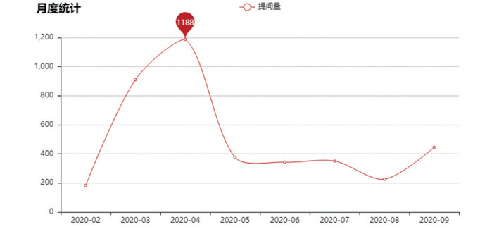 以自然月为单位进行提问量统计,结果如图2所示。图中曲线变化明显,从2月智能客服机器人上线运行开始,提问量急剧上升,到4月中下旬达到顶峰,为1188个,然后急速下降,从5月中下旬到7月中下旬保持平缓,然后略有下降,8月中下旬达到谷底,然后又快速上升。提问量的变化和教务工作紧密相关,具有明显的学期特点,开学初学生遇到的问题最多,随着教学活动逐渐步入正轨,学生遇到的问题也随之减少,在放假期间提问数最少,然后一个新的学期开始,提问数又逐渐增多。