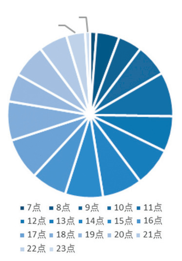 用户提问量随时间变化情况如图3所示,从早7点开始到晚23点结束,每个时间段都有用户提问,最早最晚的两个时间段提问量最少,占比1%。其余时间段基本按中间大两头小的规律缓慢变化,提问量都达4%以上。由此可见,客服工作压力很大,几乎每个时间段都是工作高峰期。对人工客服的工作时间统计如图3所示,其中大部分工作都是在工作时间处理的,同时值得注意的是,31%的对话和22%的留言都是在休息时间处理的。