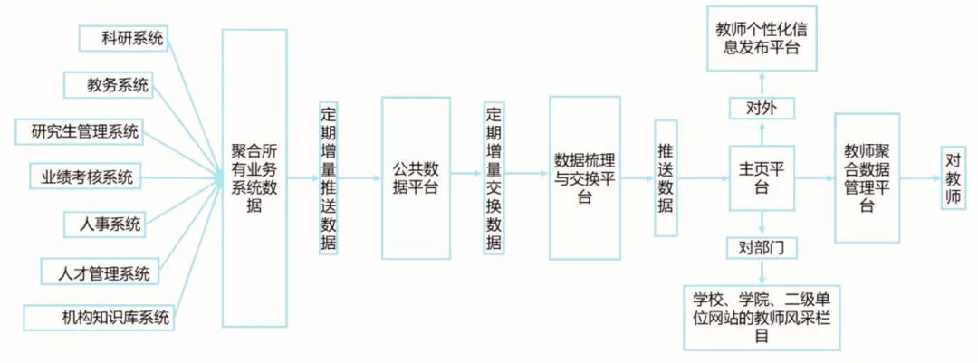 学校各业务系统负责保证数据的唯一性和权威性。通过公共数据平台进行数据清洗后,将结构化数据定时增量推送至教师个人主页平台,平台提供各种形式的信息发布,同时通过接口、视图等方法将数据分享给其他业务系统使用。