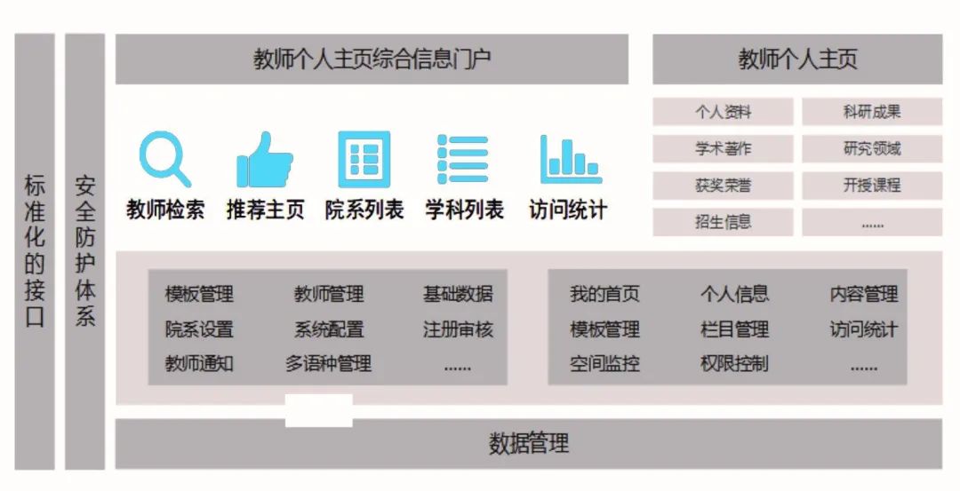 为解决以上诸多问题,需要学校统筹规划,建立面向全校教师的个人主页平台。平台以教师需求为导向,实现个人主页的操作简单、维护便捷;融合所有与教师相关的数据,实现内容自动同步、及时更新;以平台为突破口,推动数据治理与数据共享,充分展示教师个人数据。
