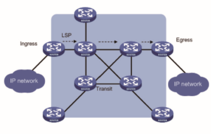 分组在入口LER被压入标签后,沿着由一系列LSR构成的LSP传送,其中,入口LER被称为Ingress,出口LER被称为Egress,中间的节点则称为Transit。