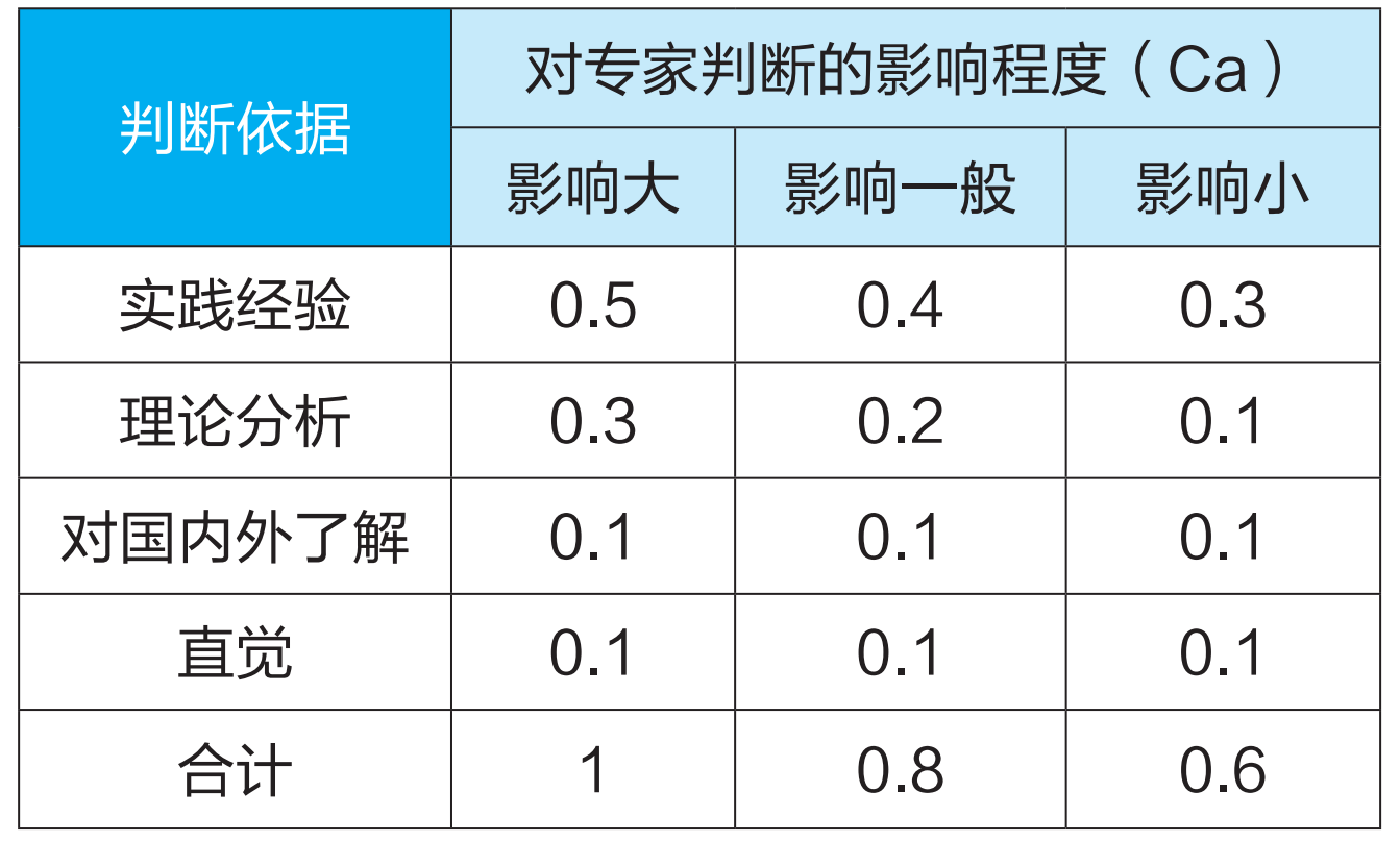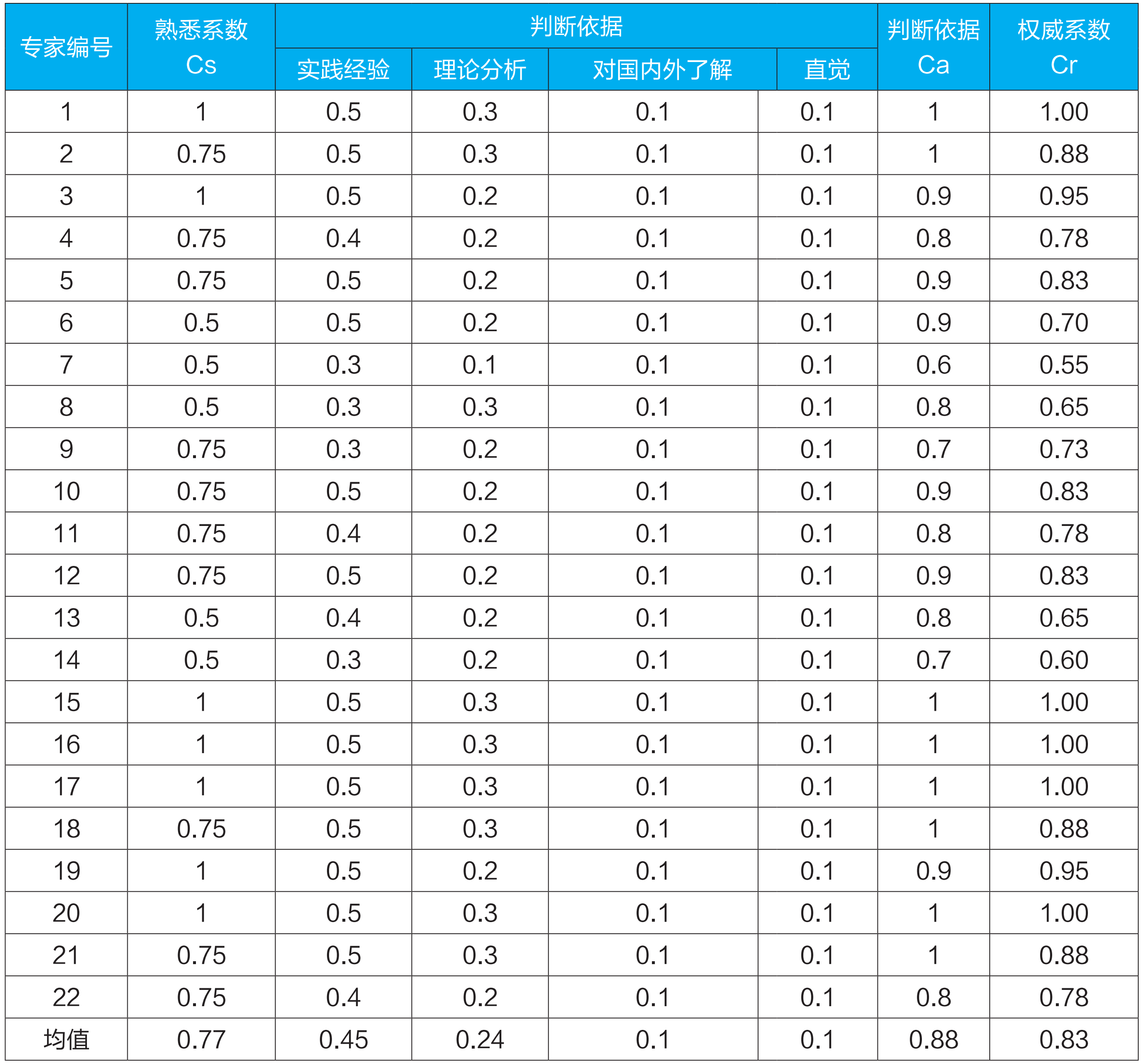 专家积极性系数按照问卷回收率来表示。第一轮和第二轮均发放22份问卷,用于德尔菲法的专家咨询,均回收22份有效问卷,问卷回收率为100%,代表专家积极程度很高。