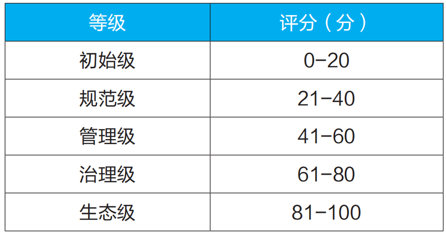 第三,评分标准细化程度不够。目前对于三级指标水平层级进行了等级划分,但是某些定性描述容易受主观判断的影响,比如“部分”“一定程度”等描述,需要进一步量化指标,进行详细的、系统的定量描述和分析,提供更加一致的评估标准,才能持续提升评估结果的公平性和客观性。