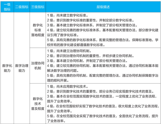 随着高校数字化建设的不断深入,其数字化成熟度也会逐步显现阶段式的提升。处在数字化成熟度不同阶段的高校,对数字化的投入、重视和参与程度都各不相同,其数字化建设水平不尽相同。为满足新时代教育数字化转型的新要求,对于高校数字化成熟度的水平进行评估,应提供具体层级区分的评估指标,从而做出合理化判断,为高校实现向更高水平数字化成熟度迈进提供参照标准。