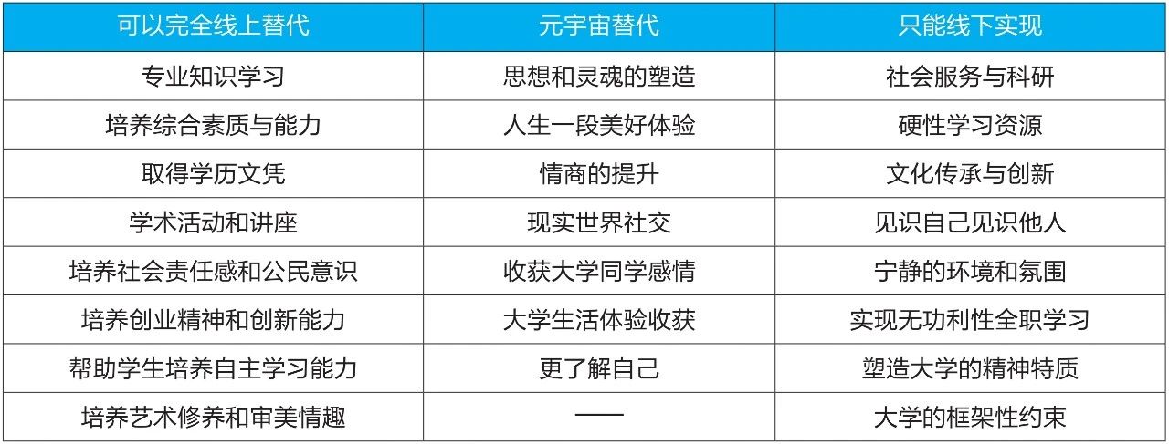 笔者整理出23个大学的功能和事项清单,分成三类。包括8个可以完全线上替代的,7个通过元宇宙相关技术加持可以实现数字化替代的,8个只能线下实现的。详情见表1。