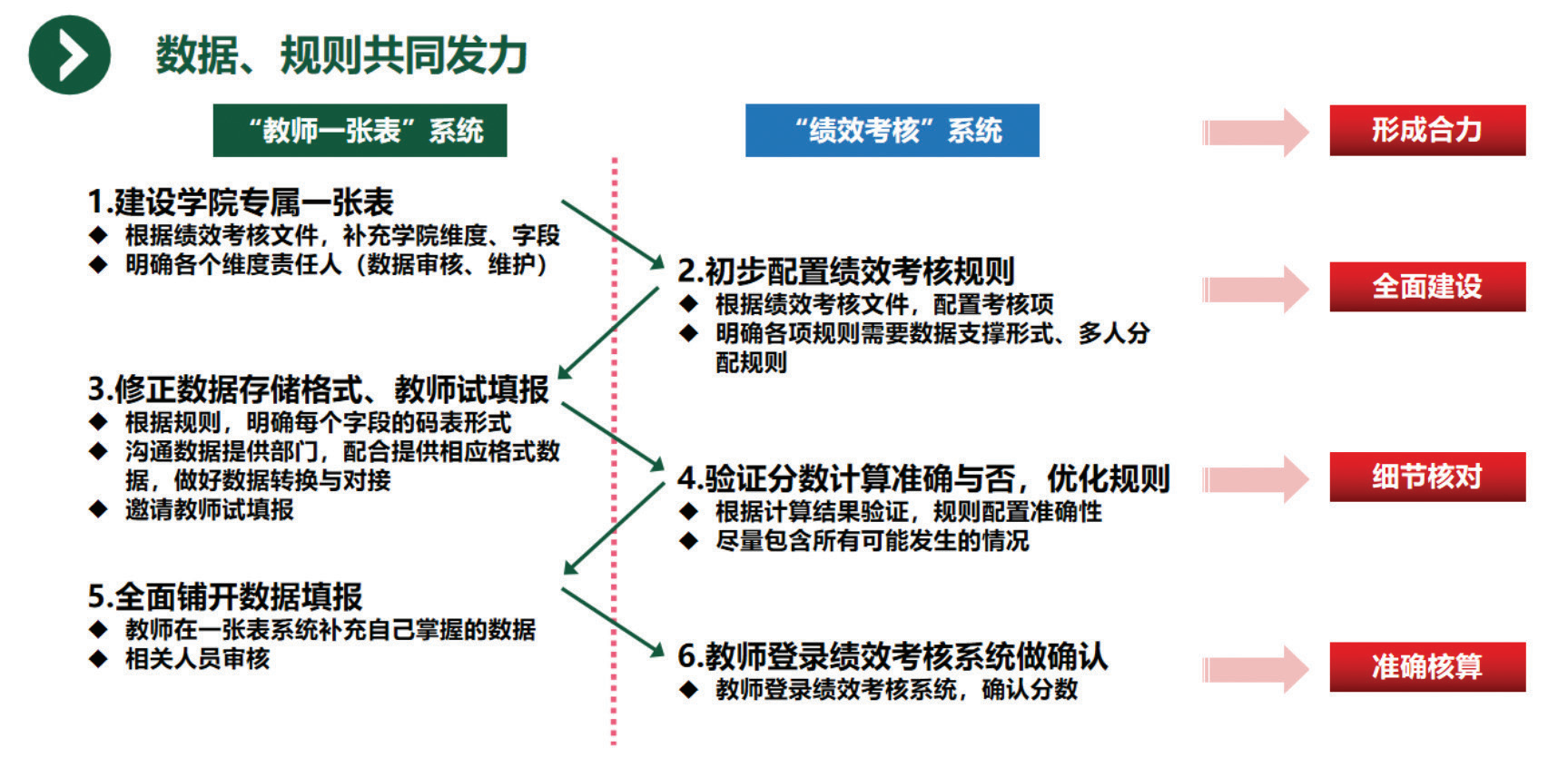 总结而言,校内现存的绩效考核模式下,存在教师填表累、一线秘书计算工作量大、学院管理难的痛点,严重制约了学校管理水平的提升。针对这一现状,学校依托数据治理及职称评审工作经验,明确了学院绩效考核信息化系统建设方案。建设过程中始终坚持为学院“提速减负,赋能管理”,基于数据层面(“教师一张表”系统)和规则层面(“绩效考核”系统)两条工作主线,共计六步工作步骤(如图2),协同发力支撑学院绩效的数据收集及分数计算。