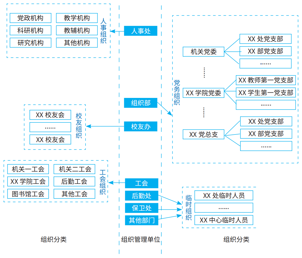 为方便学校人员管理,高校会将每个个体归属到某个具体的二级单位。目前普遍采用的组织架构主要是人事组织架构。然而,仅依赖人事组织架构难以满足学校多样化的业务办理需求。如分工会办理业务时,需依托工会组织机构。通过调研发现,单一的人事组织架构已无法适应高校信息化发展的需求。因此,亟须构建一个多维度、层级明确、架构清晰的群体组织机构体系。基于研究及数据治理实践,我们将人员组织机构划分为以下五类:人事组织、党务组织、工会组织、校友组织、临时组织(如图3)。