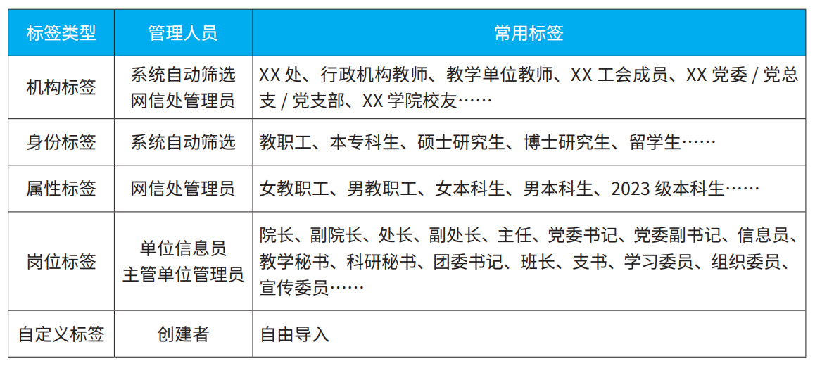 高校人员的岗位和标签在信息化平台管理中承担着重要的作用,岗位和标签既有区别又有联系,在平台使用过程中各有用途。具体而言,岗位是一个具体的职位,有明确的职责和要求,通常对应于一个特定的职位或职务,必须依附于某一个或几个组织机构。标签则用于对人员的身份、组织、岗位或其他信息进行筛选,描述人员的特征或属性,可以没有组织机构属性的概念。简言之,岗位和标签都是高校人员管理的重要成部分,共同促使信息系统人员权限管理更加便捷。