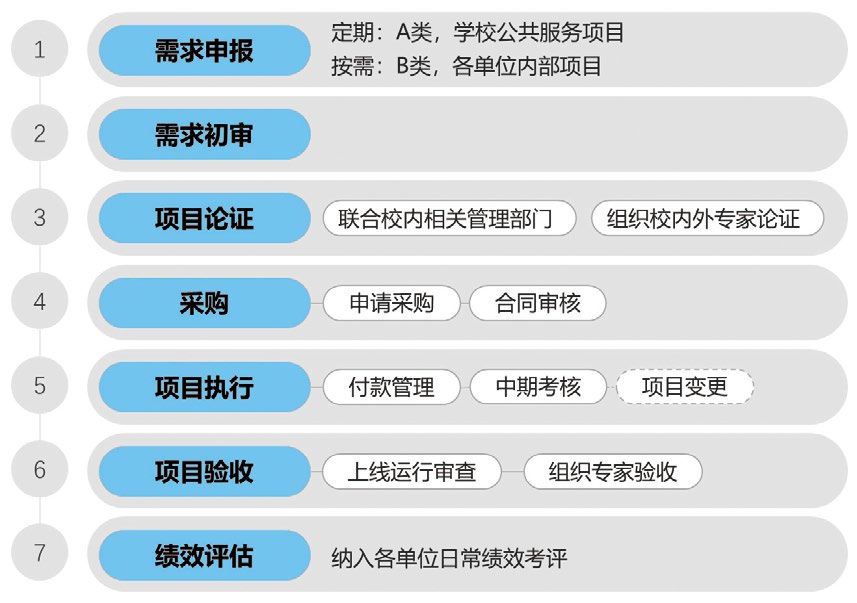 针对信息化管理存在的需求多统筹弱、重建设轻应用、多头管流程繁、网络安全挑战等问题,学校于2021年发布《信息化项目管理办法》,按照“统筹规划、归口管理,各司其责、效益评估”的原则,明确了信息化项目管理的范围、类别、职责与流程,如图3所示,配套制定了实施细则和技术规范,实现信息化项目全流程精细化闭环管理。