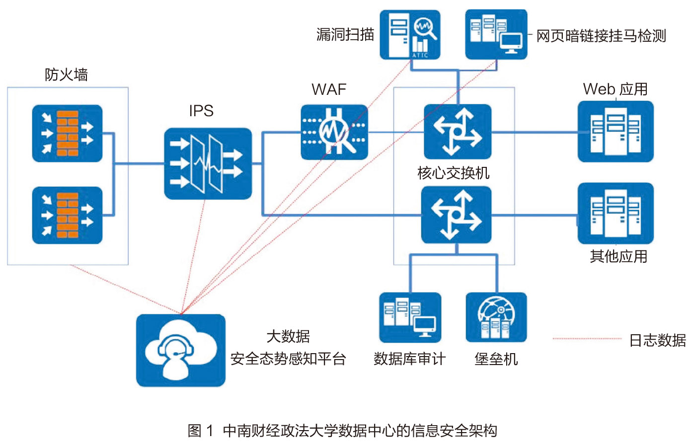 1.纵深防护体系的建设。主要目的是抵制外部各类入侵事件和攻击事件,分级保护重要应用系统,并根据威胁特点选择面向不同技术层面的安全防护产品。根据数据中心目前及未来至少5年的实际需求,选择适合性能的防火墙、IPS、WAF设备进行安全防护。此类设备串行在网络中,除安全功能方面外,也需兼顾性能指标,避免在流量需求不断增加的情况下,设备无法满足高吞吐量而淘汰。目前,下一代防火墙已经集成了很多安全功能特性,如防火墙、IPS、WAF、防毒等功能。下一代防火墙有其优点:管理与监控方便,无需登录多台安全设备监控与调试;可直接监控管理到7层应用等。在中南财经政法大学数据中心安全建设中,采用传统的架构,IPS、WAF均为单独设备。主要考虑原因是防火墙是利用原有的高吞吐量防火墙,实现ACL、端口级控制,同时也考虑到安全态势感知平台对同品牌IPS、WAF的安全日志兼容性更强的问题。IPS部署在整个数据中心核心交换机与防火墙之间,大部分DOS攻击由防火墙进行阻断,IPS主要实现入侵防护、数据泄露防护、高级威胁防护、僵尸网络发现等功能。WAF部署在Web应用区域,对学校的网站进行Web漏洞防护、Web插件防护、跨站脚本防护、SQL注入防护等。