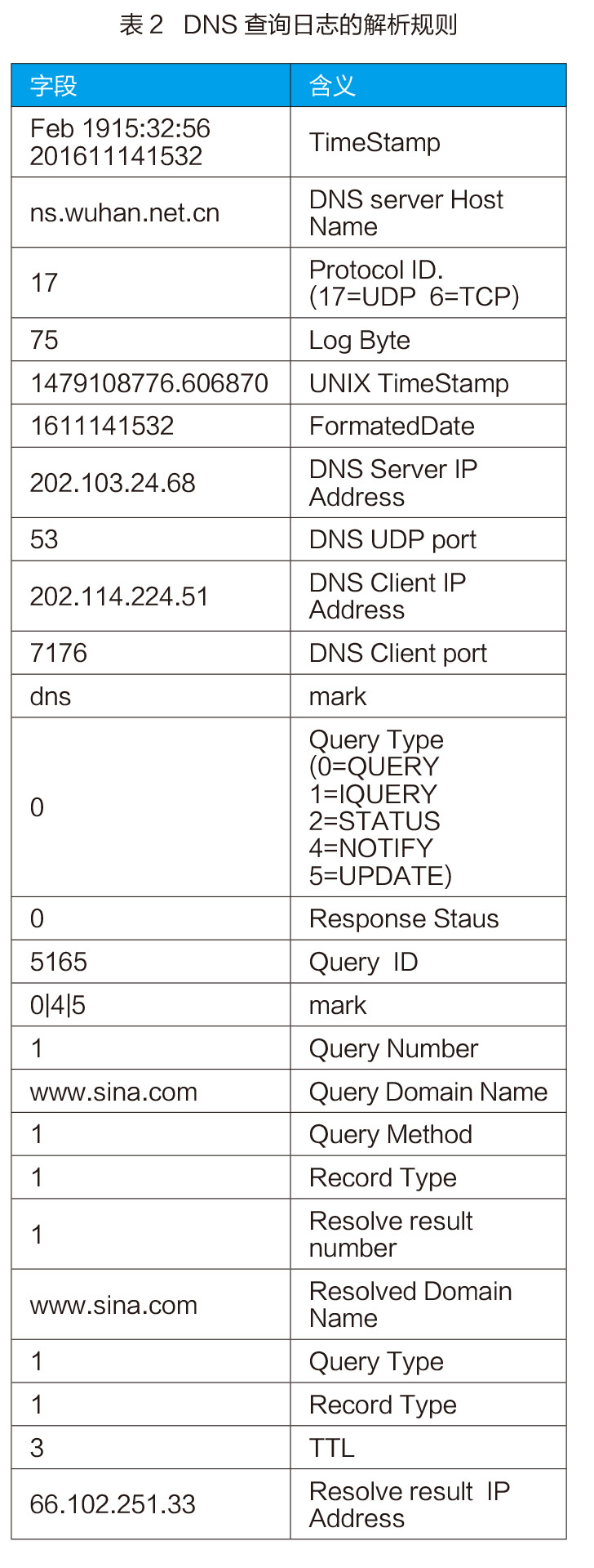 DNS查询日志的解析规则如表2。