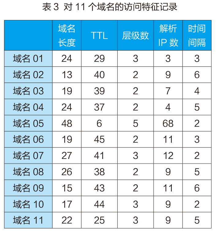 在一次取样分析中,对11个域名的访问情况进行特征记录如表3。