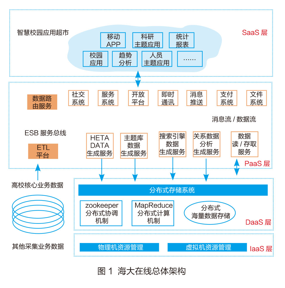 海大在线总体包括一个核心、三项业务、四大系统。其中一个核心是指海大在线核心技术框架,该框架包括四大核心层次,分别是软件应用层、服务接口层、数据服务层、基础设施层。该框架为移动端程序、后台程序提供代码标准、接口标准及数据标准,形成一个总的核心驱动层。三项业务:以核心驱动层为基础,提供业务驱动层,分别是消息交换机中间件(即时通讯平台)、开放平台和混合开发中间件。四大系统:以业务驱动层为基础,派生出系统层,包括:社交系统、消息系统、服务系统和应用系统。此后所有的校园移动信息化需要的应用插件、服务插件等都由四大系统引擎继续派生,它让移动信息化过程有标准可依,可以大大减少移动化带来的资金成本和时间成本,而且由它构建的移动化软件平台在用户体验上、在开放性上都是一流的,可以极大程度上满足学校服务师生的目标,如图1所示。