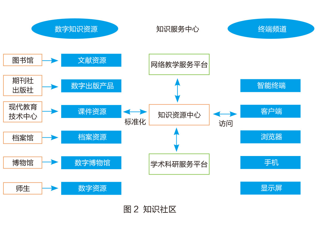 跟随着大规模、灵活性高、个性化的信息社会发展的步伐,大连海事大学知识社区(如图2所示)也在逐渐构建、发展、完善中。基于大数据的海大教学科研创新服务以知识资源为核心,提供标准化的数字知识资源、网络教学服务、学术科研服务并支持各个终端频道访问,沉淀知识资产不是目的,而是要让个性化的内容传播给需要的人,让有价值的知识、经验为更多人所复用,让每个人都成为知识的生产者、传播者和学习者。