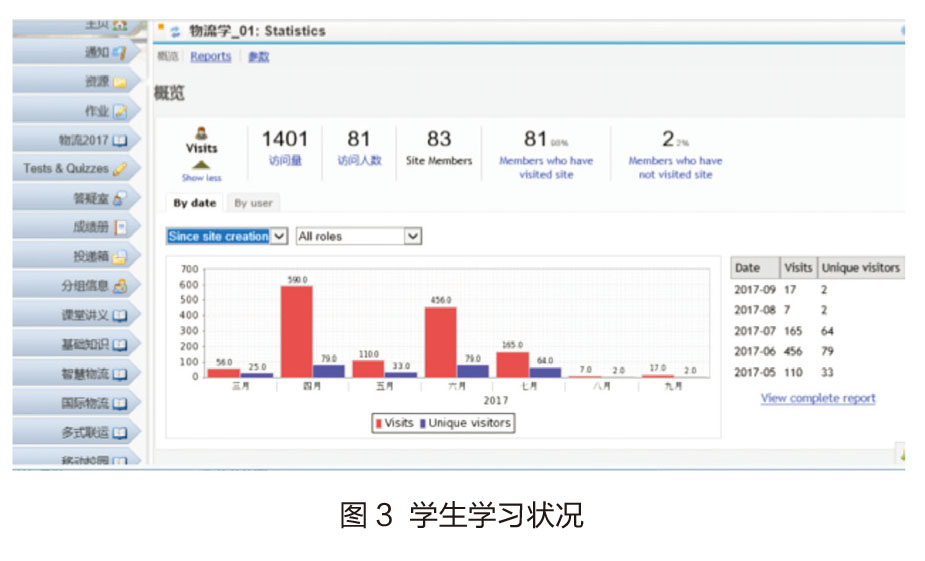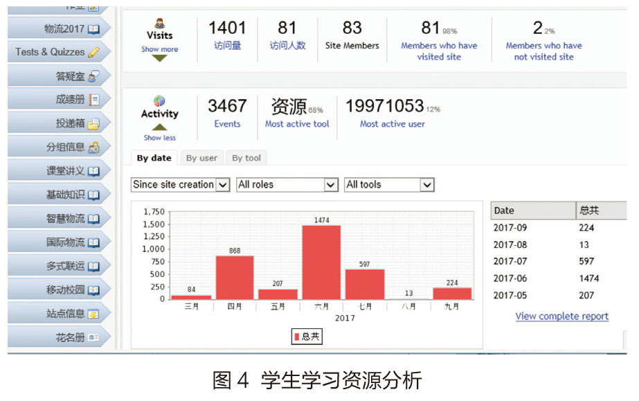现在的“物流”通识课已经逐步融合MOOC的高度开放性和SPOC的针对性的很多功能,从课堂点名、课后作业、平时考核、课程中的资料展示、课后师生交流等等,在丰富知识的展现形式,提高学生的参与热情的同时,也逐渐让学生熟悉海大在线这样的在线教学系统,会随着实际老师教学需求的改变和学生学习需求的改变进行调整,双方面共同的努力,也是实现了师生间的“通识”。学生学习资源分析如图4所示。
