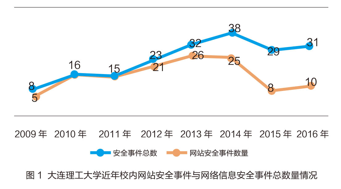 大连理工大学网站安全建设也经历了一个曲折复杂的过程的,在2002年前,由于网络资源少,学校鼓励各类网站的建设,当时的校园网给普通用户提供了开放的互联网实IP地址,在管理上仅开展了域名登记管理。之后校内网站建设进入“大跃进”阶段,校内各部门、院系、科研机构甚至项目组、个人都纷纷建立各自需要的网站,网络中心也适时地推出数据中心服务,并在2007年进行了虚拟化升级,解决了数据中心的技术和资源瓶颈,同时在网站建设技术上对校内进行了一定引导、建立了相应的技术规范。但随着网站数量越来越多,近千个Web网站和Web应用其使用的开发语言及软件环境五花八门、开发人员素质参差不齐、运维人员严重不足,而学校又缺少信息安全相应的资金、设备,网络中心管理职能不足,校内网站的安全建设和管理基本处于濒临失控的状态。从2010年起,校内网站安全问题日益突出,网站安全事件数量占网络信息事件总数量比例居高不下(具体数据见图1),成为学校网络信息安全工作研究解决的主要问题之一。