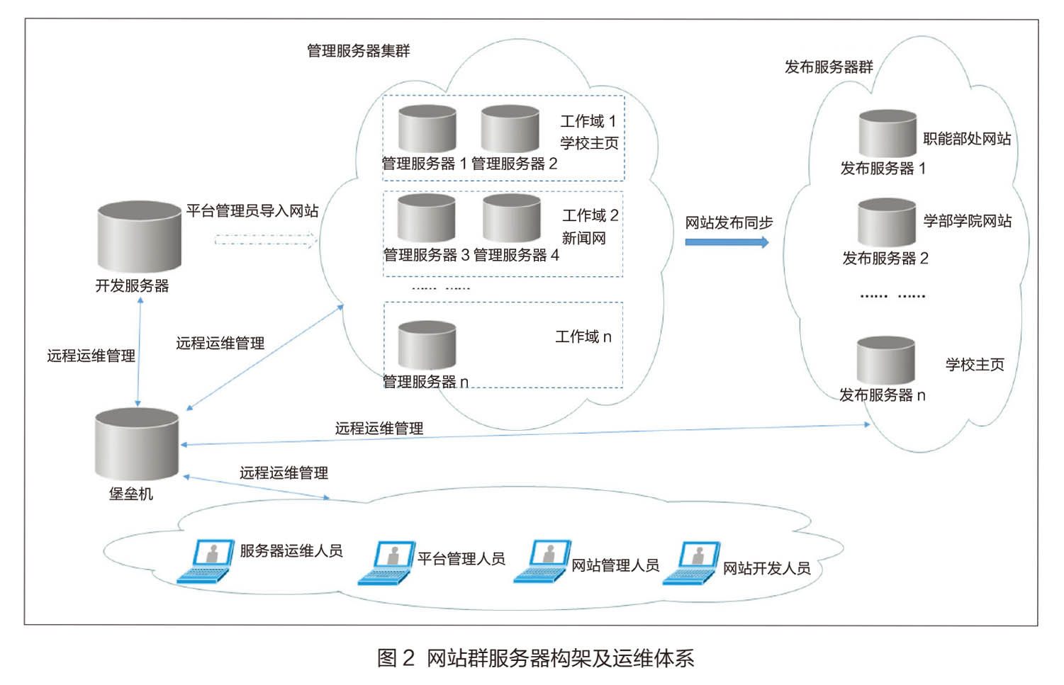通过堡垒机、统一身份认证等技术对人员访问权限进行严格区分。运维审计系统-堡垒机不仅仅可以对设备、服务器的远程操作(如远程桌面、SSH、Telnet等)提供统一登录工具,还可以对Web应用、数据库远程管理工具(如PLSQL等)等服务通过应用发布形式进行统一访问。更重要的是,堡垒机具有完善的审计功能,记录所有的运维操作,可通过视频、文本等多种方式重现,还可以预先定义非法的恶意操作,通过审计系统实施监控告警并阻断,从而规范和监督运维操作。目前大连理工大学网站群平台服务器的远程运维必须提供堡垒机,由网信中心专人及厂商共同完成,具有服务器运维权限。网站群平台管理员由网信中心专人担当,具有平台的超级管理权限,负责平台其他人员权限的分配,负责将开发完的网站从开发服务器导出到管理服务器并配置发布。网站管理员仅有管理服务器中相关网站的管理权限,必须是校内在职教工,必须通过学校统一身份认证登录。网站开发人员,仅有开发服务器权限,可以是第三方技术人员,开发人员账号都是临时账号,网站开发完成后,将清理此类账号。平台管理员、网站管理员、网站开发人员的角色权限区分通过学校统一身份认证系统完成,未来计划其远程操作也通过堡垒机统一实现,并由堡垒机统一审计。
