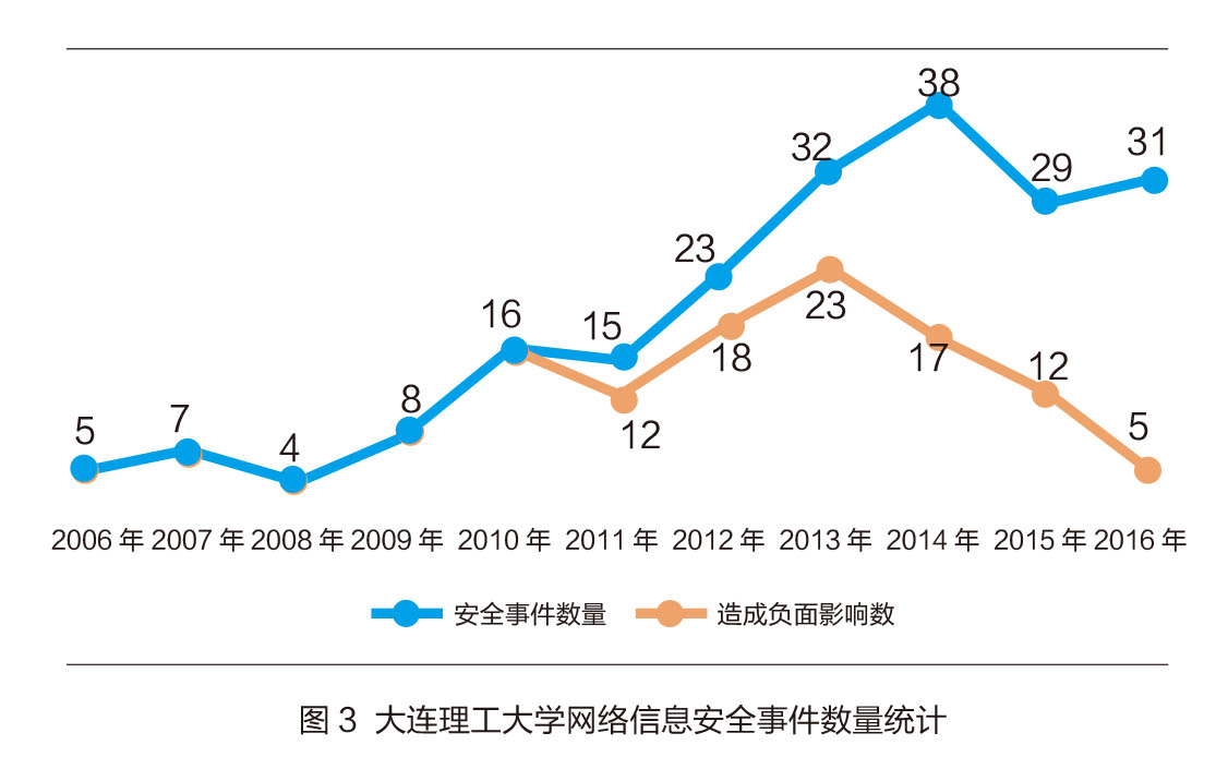 对于以上技术措施和管理制度还要辅以有力的宣传推广,才能在校内真正开展起来,一方面做好服务、宣传与培训,让校内网站的管理方、使用方真正意识到安全的重要性以及新平台的技术优势和使用的便捷性,愿意使用新平台;另一方面要坚持原则、令行禁止,对于不按照管理制度建设的网站坚决关停。经过几年的大平台的建设,校内网站安全取得了一定效果,到2017年4月,校内对外服务的网站已经全部迁移到网站群等大平台中。同时网站安全事件数量明显下降,产生负面影响的入侵事件大幅减少,详见图3,虽然网络信息安全事件数量依然处于高位,但更多的是通过各类渠道检测到的安全漏洞等预警信息。
