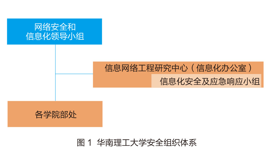 为了加强网络安全管理,推进信息化建设,组织协调学校网络安全和信息化发展与管理方面的重大事项,统筹部署学校安全和信息化工作,华南理工大学2014年成立了“学校信息化工作领导小组”,2015年改为“学校网络安全和信息化领导小组”。小组以书记、校长作为组长,以副书记、副校长作为副组长,以信息网络工程研究中心(信息化办公室)作为牵头单位,各学院部处负责人作为小组成员。图1为华南理工大学安全组织体系。