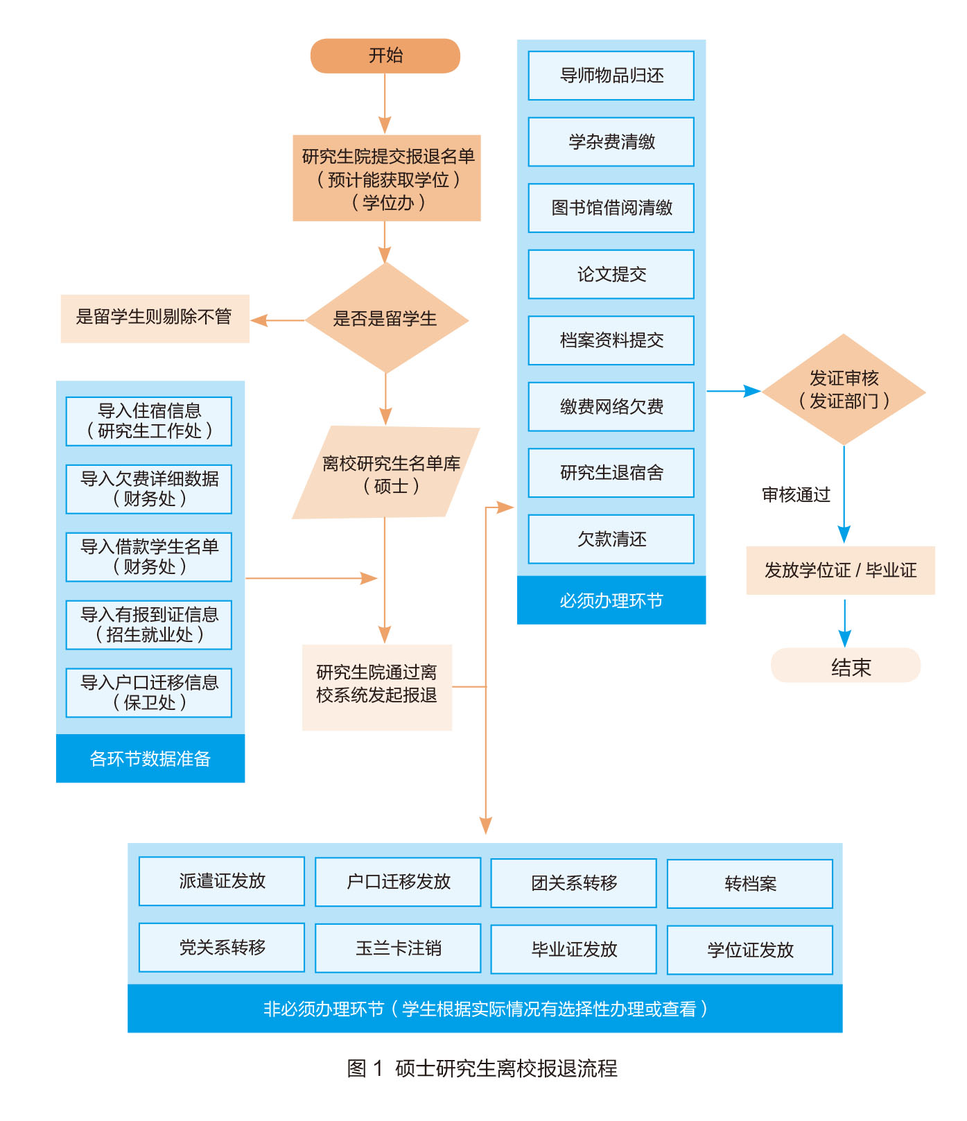 以硕士研究生报退流程为例(图1),学校将毕业生离校手续分为必须办理环节和非必须办理环节,毕业生只有完成全部必须办理的手续后,方可领取毕业证和学位证。