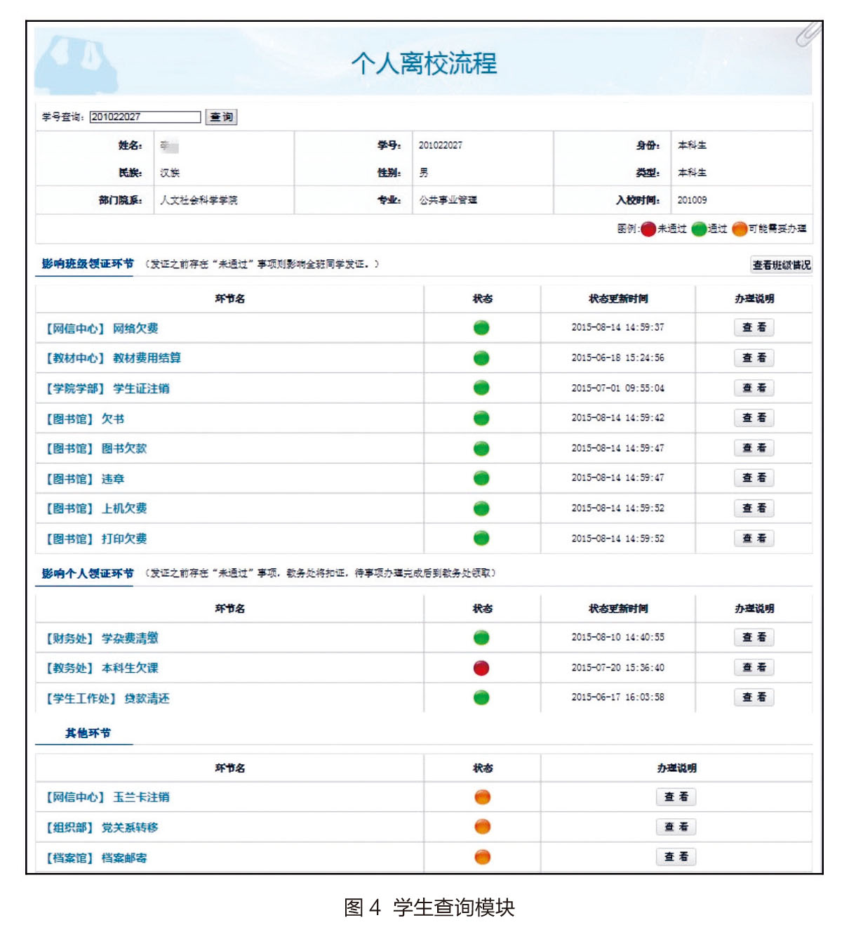 该模块主要用于毕业生快捷掌握需要办理的离校手续以及办理方式、办理状态。毕业生报退业务在查询页面中分“红灯”、“绿灯”和“黄灯”三种状态显示,分别表示“未办理”、“已办理”和“可能需要办理”。毕业生查询页面只要有红灯即表示相应业务没有办理,只有全部为绿灯或黄灯才可以领取毕业证和学位证。